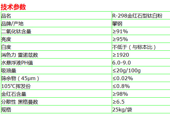 R-298是攀钢重庆钛业公司开发的新一代高档通用型的,硫酸法制成金红石型钛白粉。采用了先进的色相与粒径控制技术和氧化锆、氧化铝无机包膜工艺,具有易分散、白度好、亮度高、遮盖强、高耐候等特性,适用于涂料、塑料、橡胶、油漆等领域。 技术要求(产品执行标准Q/PYTY1-2008)。