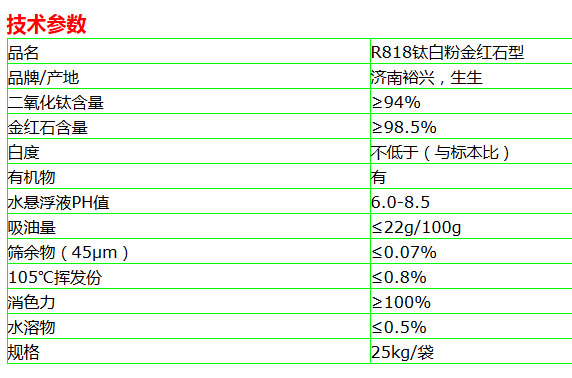R818是经无机硅铝包膜,有机表面处理的金红石型钛白颜料,具有良好的光泽度和遮盖力,耐候性高,分散性好等特点。